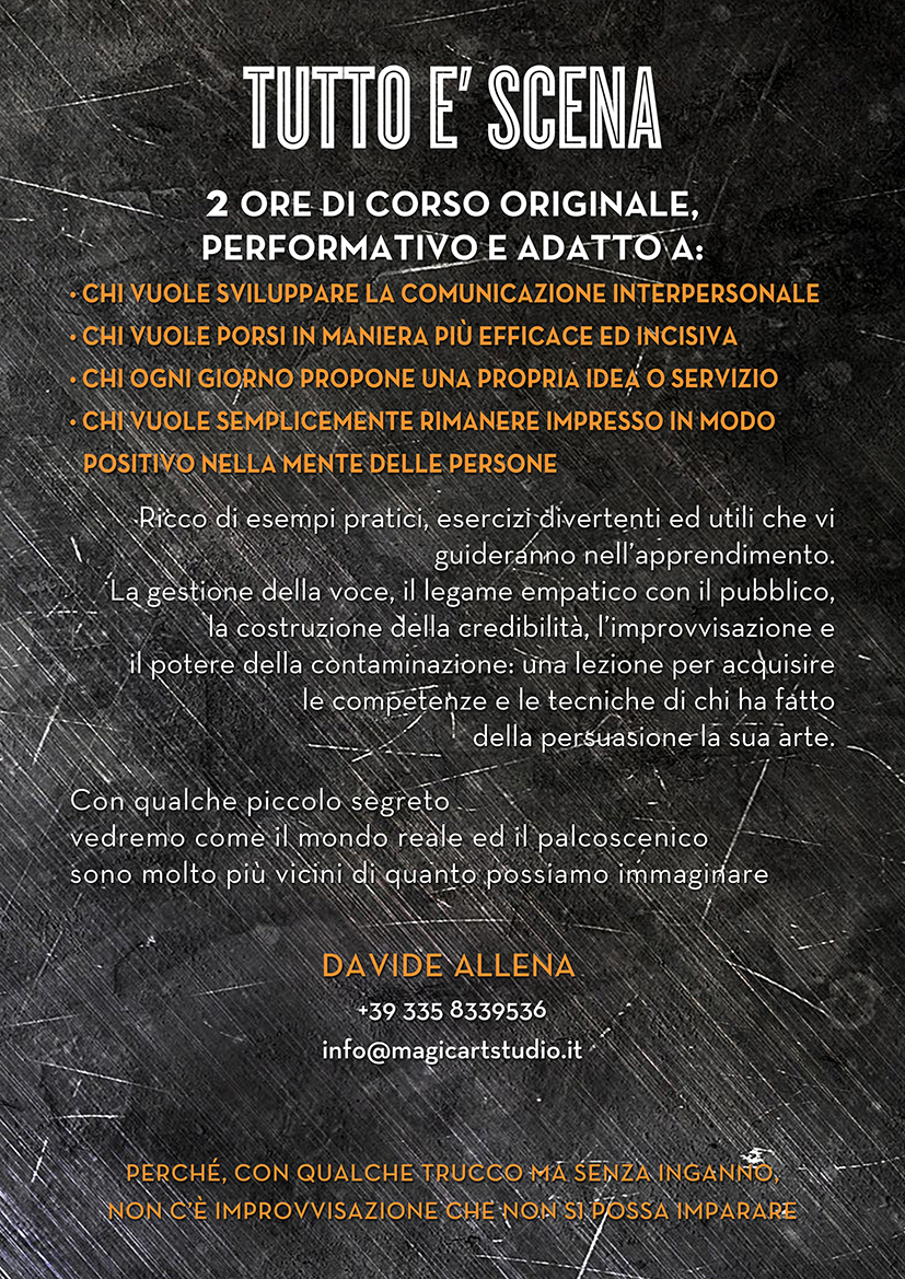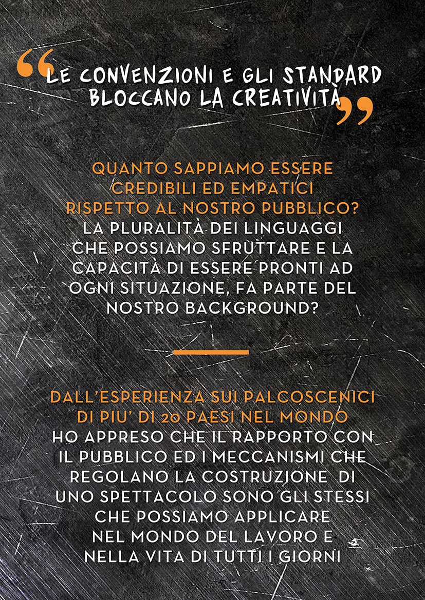 “Dall’esperienza sui palcoscenici in piu’ di 20 paesi nel mondo ho appreso che il rapporto con il pubblico ed i meccanismi che regolano la costruzione di uno spettacolo sono gli stessi che possiamo applicare nel mondo del lavoro e nella vita di tutti i giorni” Questo corso intende mettere in relazione questi due mondi apparentemente lontani, ma mai cosi vicini.